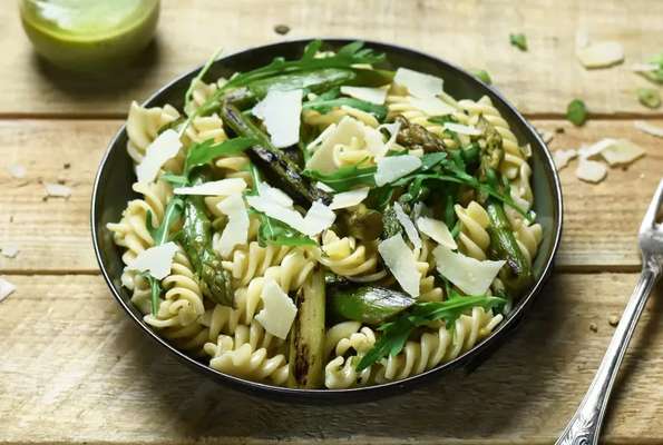 Une salade de fusilli aux asperges vertes françaises croquantes, roquette poivrée et pesto citronné maison… qui a dit que les plats veggie sont forcément ennuyeux ?
