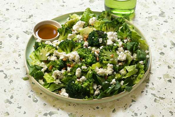 Notre salade du jardin toute verte ! Quelques brocolis frais sur de la mâche avec de la feta. Les noisettes grillées apportent la petite touche crunchy.