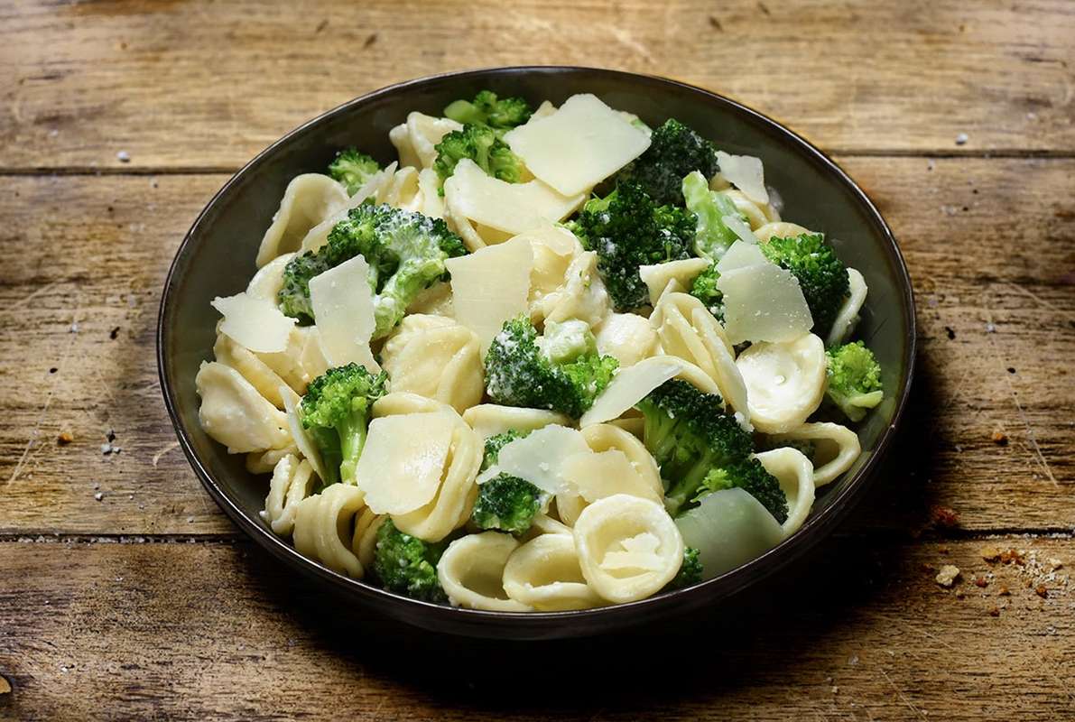 Orecchiette, Brocolis, Crème citron parmesan (crème fraîche, parmesan, jus de citron, roux blanc, sel, poivre noir), Copeaux de parmesan