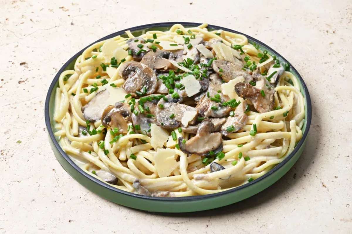 Linguine (Linguine, huile de tournesol et olive, sel), Sauce champignons (Shiitake, champignons de Paris origine France, crème liquide, crème fraîche, huile de tournesol, sel, ail, poivre), Copeaux de parmesan (Lait non pasteurisé), Ciboulette