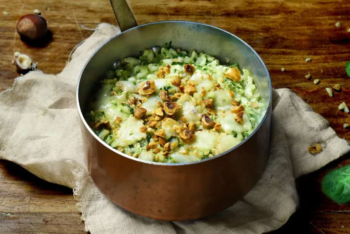 Un risotto hyper crémeux, avec du fromage de chèvre, des épinards, de généreux copeaux de Grana Padano et des noisettes !