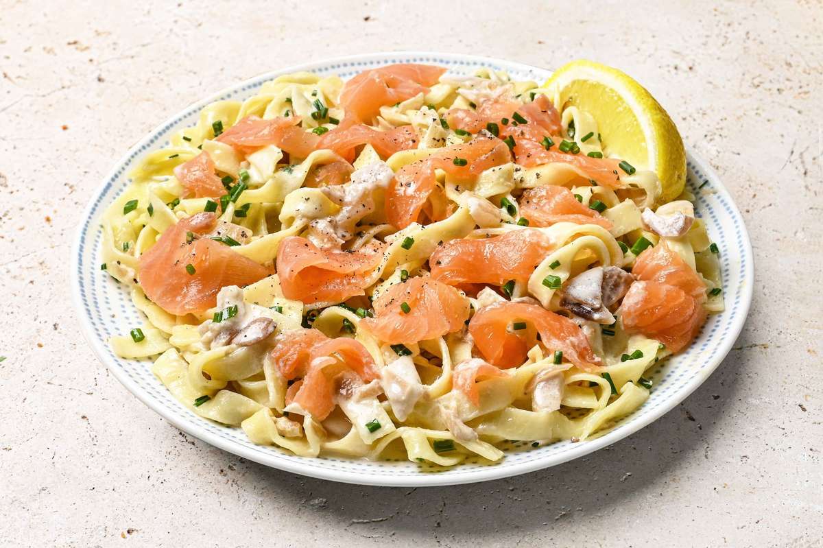 Un essentiel du quotidien dont on ne se lasse pas : des tagliatelles parfaitement cuites accompagnées d'une sauce crémeuse aux échalotes, de saumon fumé d'Écosse tranché et de ciboulette ciselée.