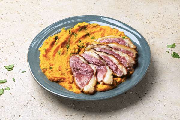 Quelques tranches de Magret de canard français et une purée riche en beta carotène et curcuma pour renforcer votre système immunitaire. Un plat réconfortant et qui prend soin de vous !