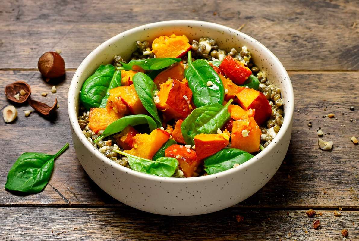 Une salade froide de lentilles du Berry Label Rouge et de potimarron en dés rôtis saupoudrés de noisette concassée. Une vinaigrette Xérès/féta apporte la pointe d'acidité.