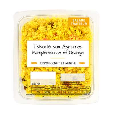 Semoule de blé dur, oranges, pamplemousses roses, jus de citron et d'orange concentrés et citron confit au sel.