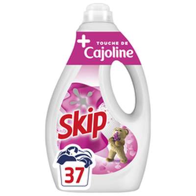 La lessive liquide Skip Touche de Cajoline 37 Lavages offre une fraîcheur intense à vos vêtements et votre linge de maison. La lessive Skip Touche de Cajoline saura vous transporter grâce à son parfum floral*, inspiré des fragrances délicates des adoucissants Cajoline, pendant 3 semaines. Toute l'efficacité de Skip dans une formule plus respectueuse de l'environnement grâce à ses ingrédients actifs d'origine végétale. Cette lessive liquide garantit un résultat impeccable pour un linge propre, doux et frais. La lessive Skip Touche de Cajoline est également efficace en un seul lavage contre les taches, même en cycle court et dès 30 °C. Avec la lessive liquide Skip, économisez de l'énergie à chaque lavage et réduisez les émissions de CO₂. De plus, sa bouteille et son bouchon sont entièrement recyclables. Cette lessive liquide convient aux machines à laver à dosage automatique (auto-dose). Versez une dose dans le bac à produit de votre machine. 42 ml : dosage recommandé pour une eau peu ou moyennement dure. Ajouter 15 ml de lessive pour une eau dure ou du linge très sale. Lavage à la main : diluer 35 ml dans 10 L d'eau. Prétraitement des taches : 1. Déposez une petite quantité de la lessive liquide Skip sur les taches 2. Frottez doucement 3. Lancez le cycle de lavage immédiatement. Skip, ce sont plus de 60 ans d'expertise et d'innovations dans le domaine des lessives, toujours guidées par une volonté d'améliorer le quotidien des familles. Skip, c'est aussi une philosophie de marque unique ! Chez Skip, nous sommes convaincus que nos enfants ont besoin d'expérimenter, de jouer dehors et de découvrir le monde qui les entoure en toute sérénité, afin de se préparer à demain. Ainsi, chaque tache peut être synonyme d'un moment de joie et de partage, d'un challenge réussi ou d'une nouvelle aventure. Pour nous, la saleté des vêtements est la marque de l'action. C'est pourquoi nos lessives sont efficaces sur les taches, même les plus tenaces. Avec Skip, la saleté, c'est bien et ça le sera toujours. Skip s'engage à prendre soin de votre linge à l'épreuve de la vie et du quotidien ! *Parfum de synthèse.