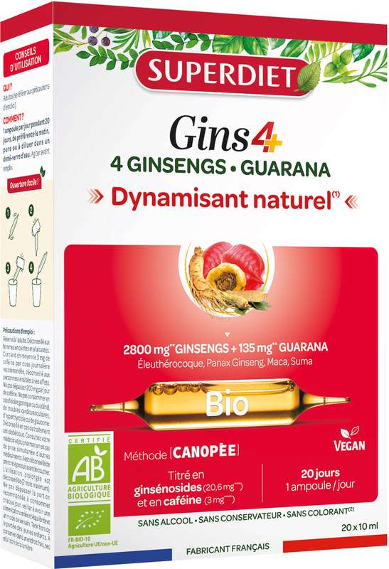 Notre formule unique associant 4 Ginsengs et du Guarana riche en caféine vous donnera un coup de boost et soutiendra votre immunité sur le court et le long-terme.