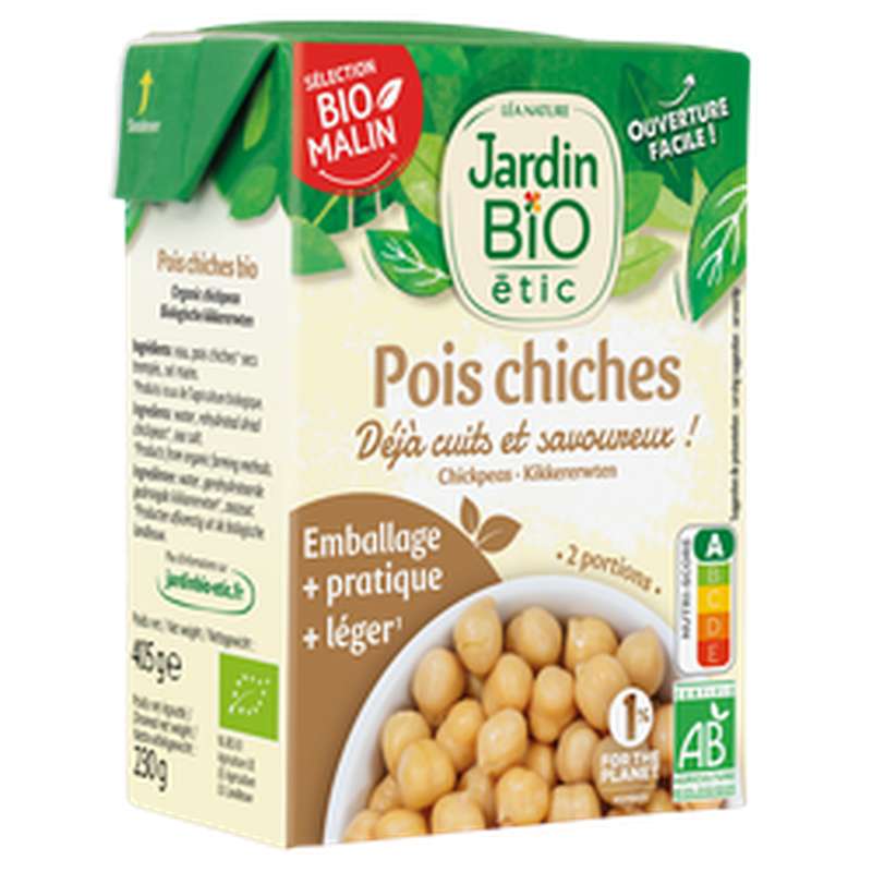 Découvrez nos savoureux pois chiches dans cet emballage en brique plus pratique, grâce à son ouverture facile et son poids plus léger qu'une conserve en verre*. Ces pois chiches déjà cuits sont prêts à consommer chauds en accompagnement ou froids en salade. *Un emballage Tetra Recart® est environ 10 fois moins lourd qu'une conserve en verre. 2 portions 1% for The Planet 100% Bio Ouverture facile Emballage + pratique, + léger Nutriscore A