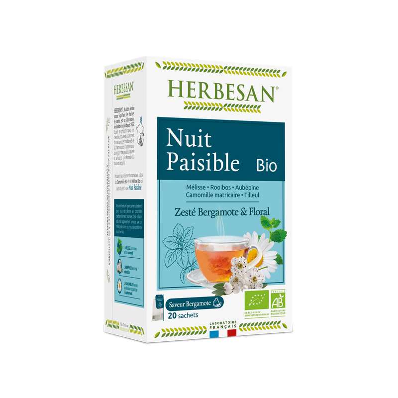 HERBESAN®-INFUSION NUIT PAISIBLE BIO - Mélisse, Rooibos, Aubépine, Camomille matricaire, Tilleul - Saveur Bergamote - Zesté Bergamote & Floral -Sans plastique- 100% plantes - 20 sachets en papier✦Notre experte herbologue, l’oenologue des infusions, vous accompagne dans la dégustation de votre infusion. Découvrez toute sa complexité et appréciez la subtilité et l’intensité de ses saveurs. À L’OEIL,Robe orangée. AU NEZ, Notes douces, florales et miellées aux nuances zestées de bergamote. EN BOUCHE, Note de tête : attaque franche mêlant des notes douces, florales et miellées à des pics plus vifs avec la bergamote qui apporte présence et caractère.Note de coeur : laisse place à des notes qui se prolongent sur un bouquet doux, miellé et floral.Note de fond : les notes restent douces en longueur. La texture est légèrement veloutée et renforce l’impression de réconfort.
