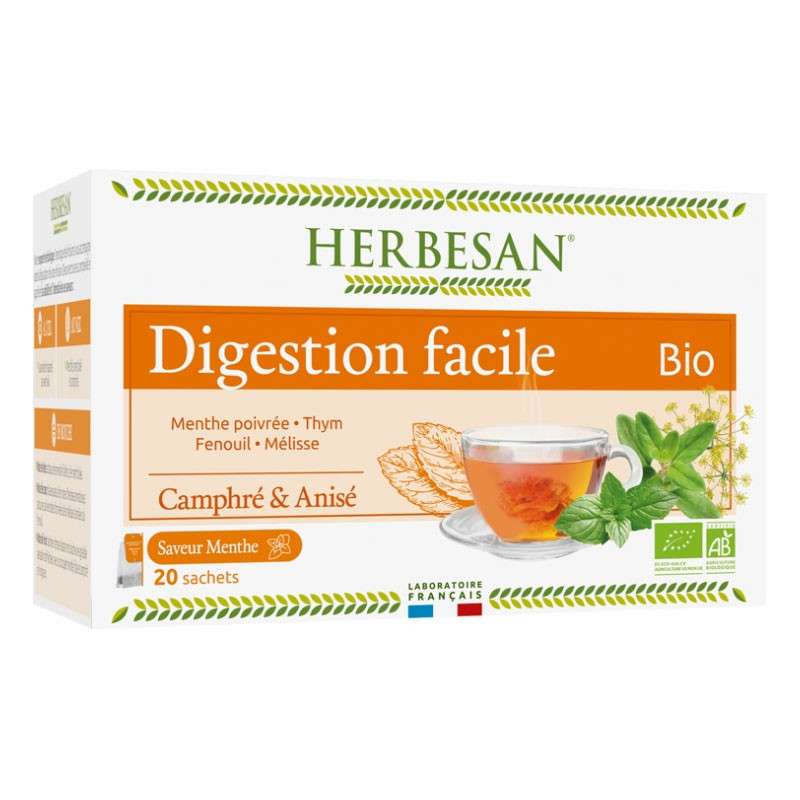 HERBESAN®- INFUSION DIGESTION FACILE BIO - Saveur Menthe - Menthe poivrée, Thym, Fenouil, Mélisse - Camphré & Anisé - Sans plastique- 100% plantes - 20 sachets en papier ✦ Infusion naturellement aromatisée à base de Fenouil Bio qui contribue à une Digestion Facile ✦ À L’OEIL, Jaune doré nuancé de vert kaki. ✦AU NEZ, Menthé, mentholé et camphré.✦ EN BOUCHE,Note de tête : attaque de menthe fraîche, très mentholée.Note de coeur : laisse place à des notes d’herbes aromatiques, adoucies par les notes citronnées de la mélisse et anisées du fenouil. Note de fond : arômes intenses laissant en bouche une agréable sensation de fraîcheur avec un bouquet menthé, frais et camphré en longueur.
