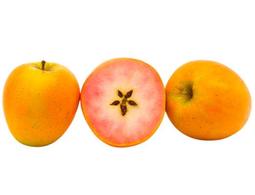 Sous sa peau jaune pâle, cette variété cache une chair rose marbrée surprenante. La Kissabel® Jaune est croquante, juteuse et bien équilibrée entre douceur et acidité.