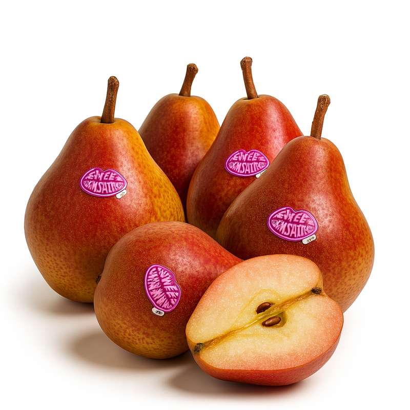 Variété haut de gamme issue de la poire Doyenné du Comice, la Sweet Sensation® séduit par sa robe rouge brique, sa chair fine, juteuse et très parfumée. À la fois douce et équilibrée, elle se déguste nature, en salade ou pochée pour un dessert raffiné.