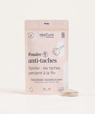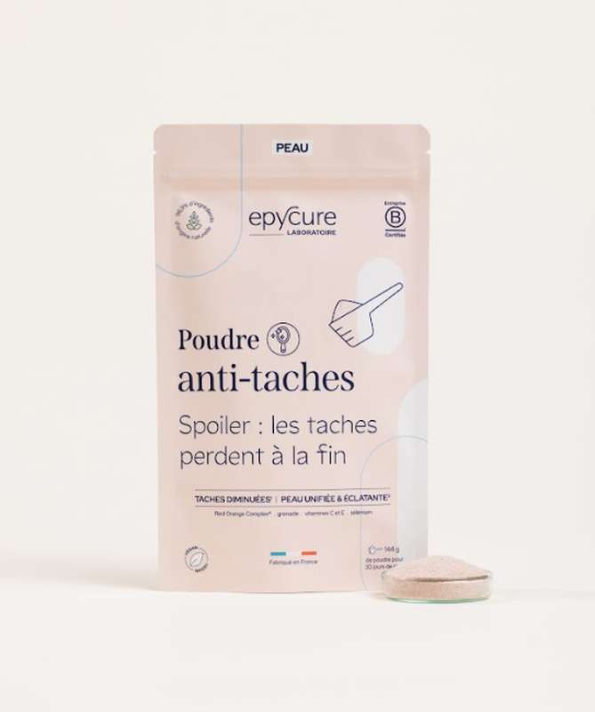"Poudre anti-taches, une cure de 30 jours à base d’extraits d’oranges, grenade, sélénium et vitamines qui permet d’atténuer les taches pigmentaires pour un teint visiblement unifié.