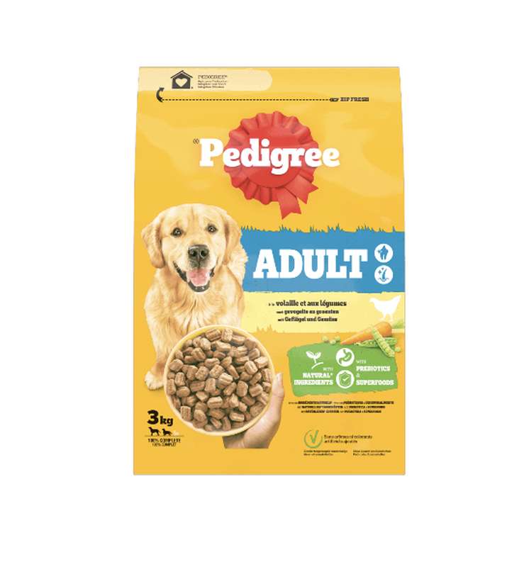 Les croquettes Pedigree® Adulte offrent à votre chien un repas 100% complet et équilibré, adapté à sa taille et à son âge, avec des ingrédients naturels et sans arômes artificiels ajoutés. Offrez une nourriture complète pour chien approvisionnée avec soin et sans huile de palme. Il est important de leur donner une alimentation spécifique à leurs besoins. Développées avec nos nutritionnistes et nos vétérinaires du WALTHAM Petcare Science Institute, les croquettes Pedigree® sont élaborées pour couvrir nutritionnellement quatre besoins universels du chien. Avec des superaliments aux propriétés naturellement bénéfiques. Les carottes sont sources de vitamine A provenant du bêta-carotène. Les petits pois sont sources de fibres et de minéraux. Tous les chiens méritent une bonne hygiène bucco-dentaire, il est donc essentiel pour eux de garder des dents et des gencives saines. C'est pourquoi nos croquettes ont une texture spécialement conçue qui aide à nettoyer leurs dents. Avec des vitamines B sélectionnées et du zinc pour l'aider à rester au mieux de sa beauté et de sa forme et permet une peau et un pelage sains. Tous les chiens méritent une bonne digestion. Nos produits contiennent des fibres naturelles, des prébiotiques, et des protéines de haute qualité, qui contribuent à un bon système digestif. Nos recettes contiennent de la Vitamine E, connue pour avoir des fonctions antioxydantes et aider à maintenir les défenses naturelles de votre chien.