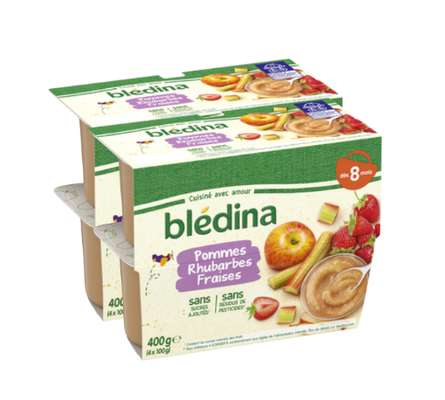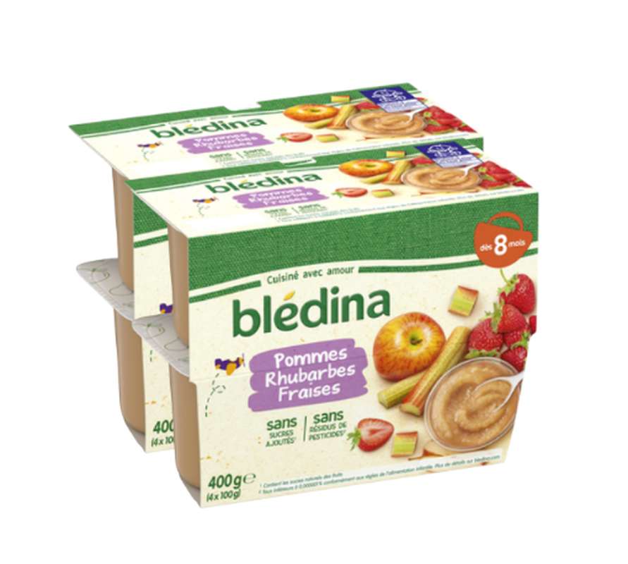 2 Lots de 4 Coupelles fruits pomme, rhubarbe et fraise - dès 8 mois, Blédina (8 x 100 g)