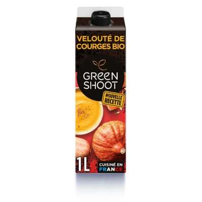 Eau de source, potiron* 17%, butternut* 13%, potimarron* 13%, oignon* 7%, CREME* 5%, bouillon de volaille* (sirop de glucose*, sel marin, viande de poulet déshydratée* (antioxydant : extrait naturel de romarin*), huile de tournesol*, arôme naturel de volaille, poudre d'oignon*, extrait de levure*, sucre*, poudre d'ail*, poudre de carotte*, curcuma*, poudre de tomate*, poivre*, arôme naturel de laurier, arôme naturel de thym, arôme naturel de girofle), sel de Guérande, poivre noir*.