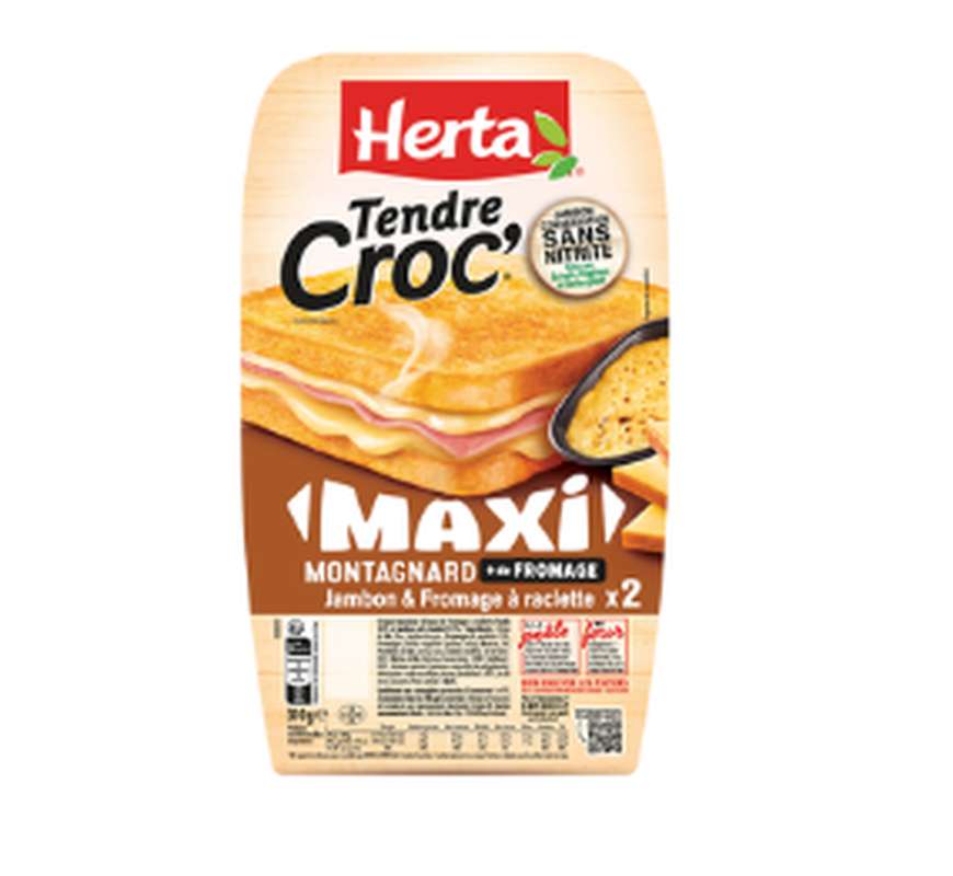 Savourez le croque-monsieur TENDRE CROC' Maxi Montagnard : deux tranches de pain de mie à la fois croustillantes et moelleuses avec une garniture fondante au fromage à raclette et au jambon conservation sans nitrite grâce aux extraits végétaux et antioxydant, en format XXL pour faire plaisir aux plus gourmands de la famille ! Les croque-monsieur de HERTA, c'est la solution pratique pour une pause déjeuner, un dîner gourmand en famille ou entre amis. Au four ou à la poêle, tout le monde se régale !