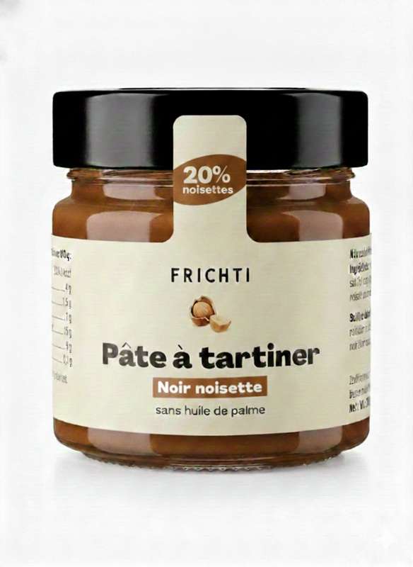 Ingrédients : sucre, graisses végétales (huiles : tournesol, grignon d'olives, carthame et beurre de cacao), pâte de noisettes 20%, cacao maigre en poudre 16%, émulsifiant : lécithine de soja.