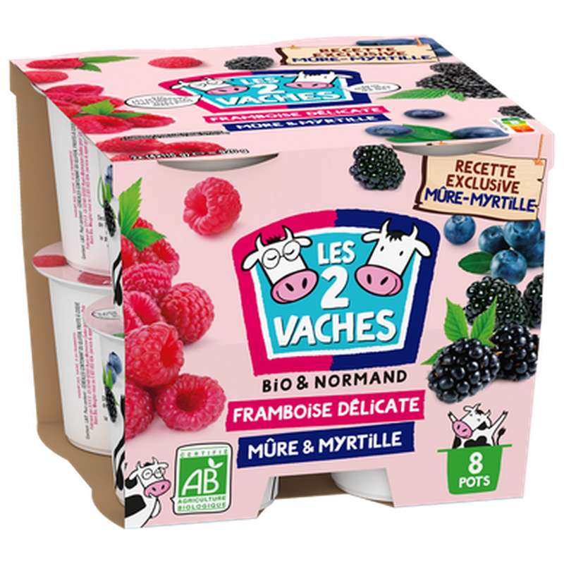 Découvrez les yaourts brassés bio Mûre-Myrtille et Framboise de Les 2 Vaches ! Confectionnés au cœur de la Normandie, dans notre laiterie du Molay-Littry, ces yaourts brassés aux fruits sont produits avec de la crème et du lait Normands, 100% bio et certifiés équitables, une pointe de sucre et des mûres, myrtilles et framboises bio délicates dont nous soutenons la filière. Ces brassés Mûre-Myrtille et Framboise sont tous deux Nutriscore B. Ils peuvent être dégustés au petit-déjeuner, en dessert ou même pour une pause gourmande au goûter !