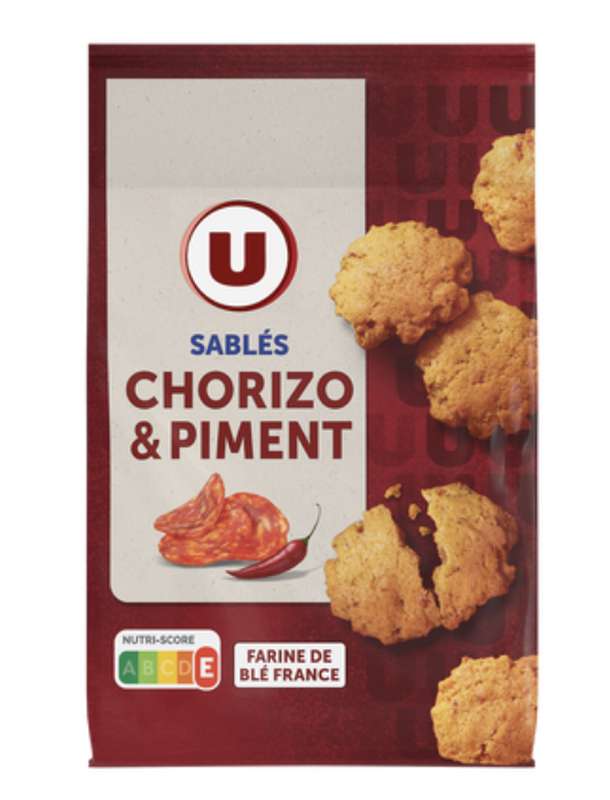 Farine de BLE 54%, BEURRE (LAIT) 25%, amidon de BLE, chorizo haché 13% (échine de porc, sel, paprika, ail), OEUFS, oignons grillés en poudre, sel de Guérande, paprika, arôme naturel, poudres à lever : carbonates de sodium, poivre blanc en poudre, anti-oxydant : extraits de romarin, piment de cayenne en poudre 0,05%. traces éventuelles de fruits à coque, de moutarde et de soja. origines : farine de blé france. lait et porc europe.